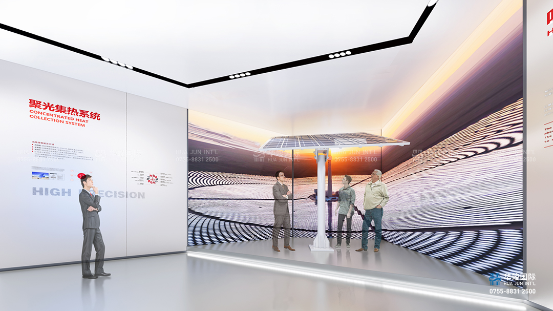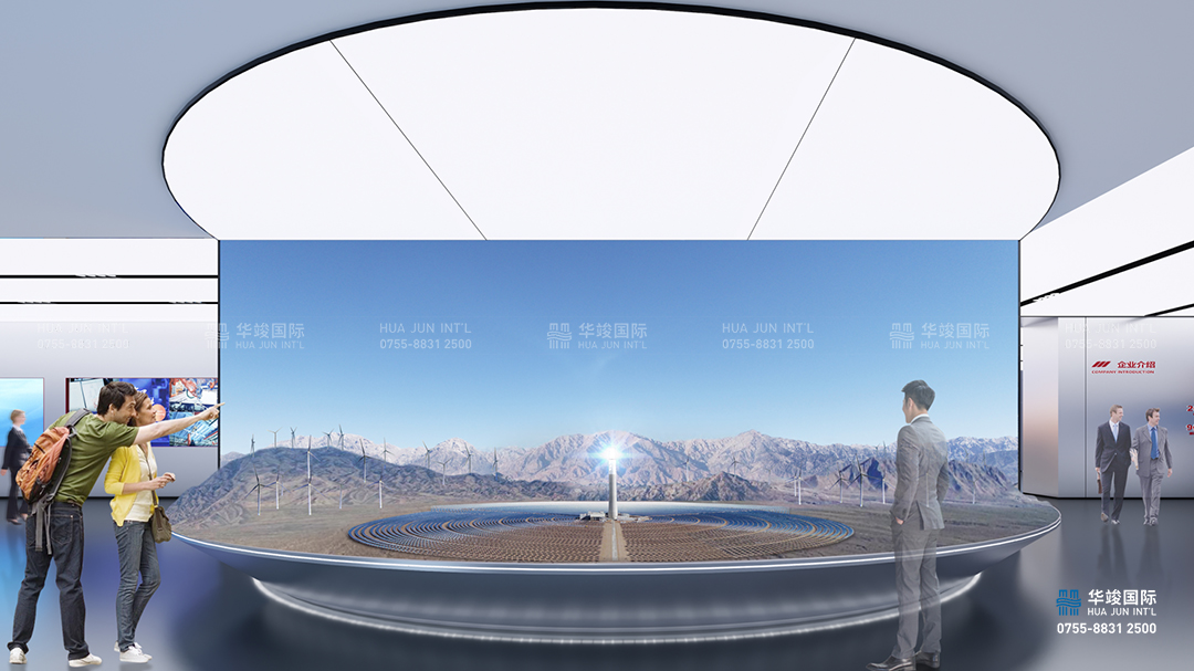 在蒼茫的戈壁灘上一朵盛開(kāi)的“太陽(yáng)花”,結(jié)合數(shù)字場(chǎng)景模型,打造沉浸式情景劇場(chǎng),營(yíng)造浩瀚廣袤、生機(jī)勃勃的空間氛圍,展示從聚光、集熱、儲(chǔ)熱到發(fā)電的全流程塔式光熱發(fā)電核心技術(shù),實(shí)現(xiàn)了核心裝備的產(chǎn)業(yè)化、國(guó)產(chǎn)化。
