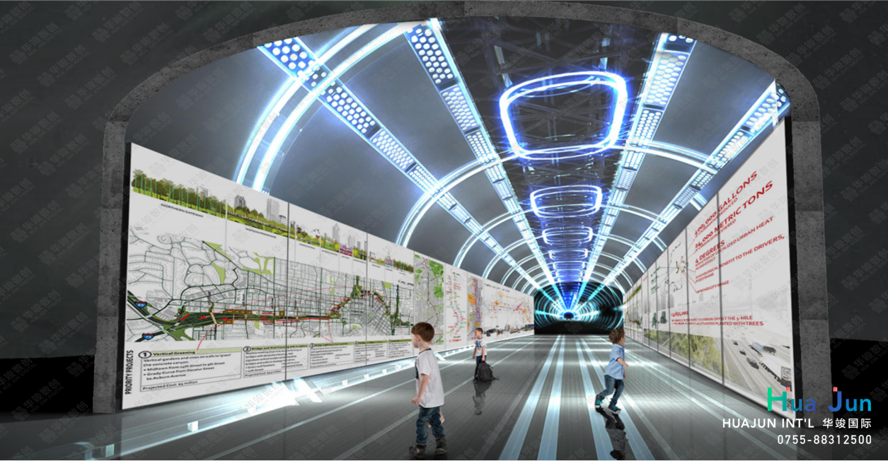 海洋中的工程奇跡-深中隧道。整個空間以隧道為元素,通過隧道空間氛圍的營造,觀眾仿佛走到了隧道世界,兩邊用投影拼接,顯示隧道剖面交互畫面,讓觀眾更深入了解隧道構造知識。通過對弧形屏幕點擊,了解到深中隧道建成技術知識等難關。