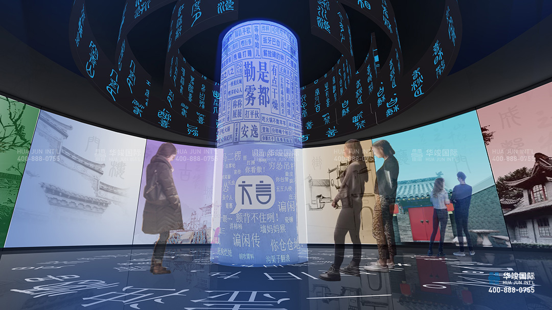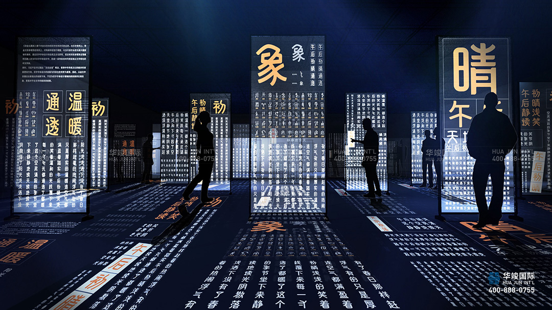 以開卷形式的背墻效果,打造漢字六書的效果,中間以藍(lán)色燈光效果的光柱為主要形式,將第一展廳的名稱放置在中間。頂部的方柱頂上將二維碼的內(nèi)容植入進(jìn)來,觀眾通過掃碼了解相關(guān)漢字六書的知識點。