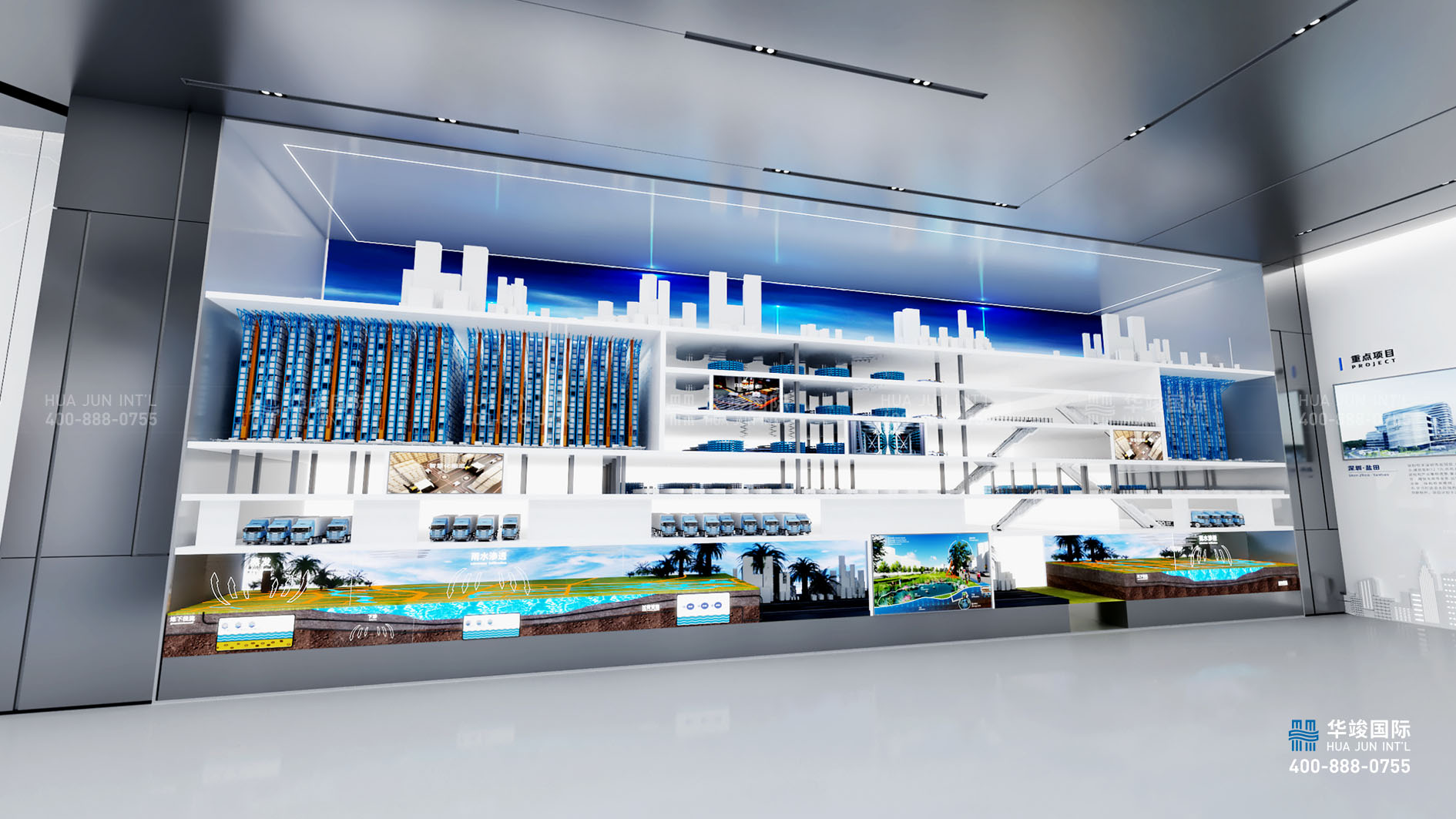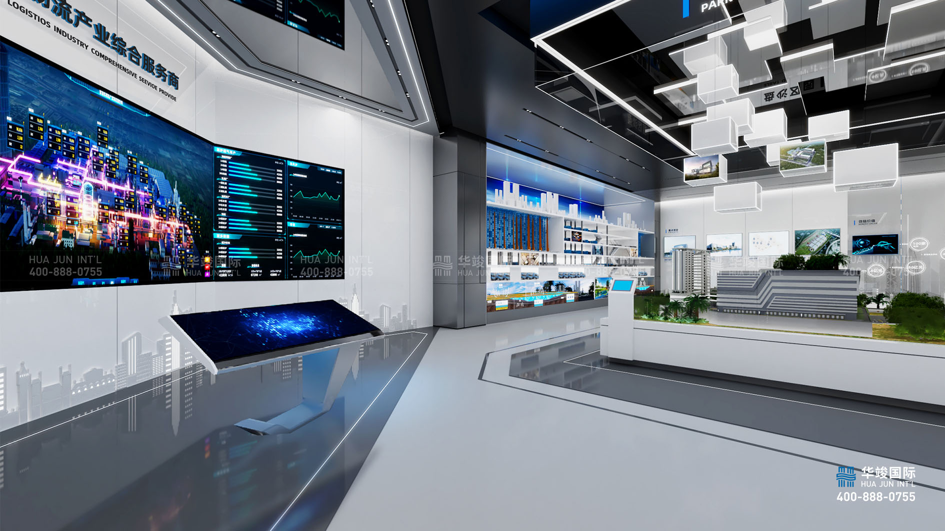 深國際物流企業展廳設計光項目展示中心由華竣數創執行整體設計施工。華竣以創新的智慧展廳設計理念,開啟一段現實世界與數字世界完美融合的品牌塑造之旅,建設一個集產品體驗、用戶體驗、品牌展示、全景物流主題藝術裝置等多種服務和功能為一體的敘事體驗空間。