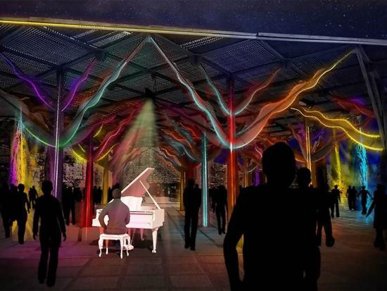以“宮商角徴羽”傳統(tǒng)五音文化為理念打造的海心沙作品區(qū)域是本屆燈光節(jié)的核心和重點(diǎn)區(qū)域。